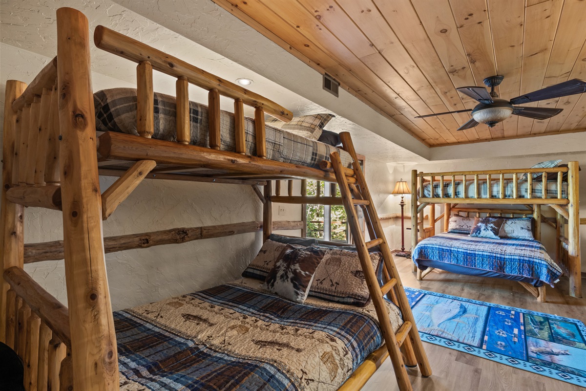 This luxury lodge cabin has many unique upgrades including chef's kitchen with leathered granite countertops, stainless Viking appliances and exquisite stonework. It boasts 4 bedrooms/3 bath and a loft (King master on main with sleeper sofa, Queen on main, King upstairs bedroom, Loft with sofa sleeper, and downstairs has both Full/Twin bunks and a Twin bunkbed) 3 baths (1 full shower main, 1 full shower upstairs and 1 soaking tub downstairs).