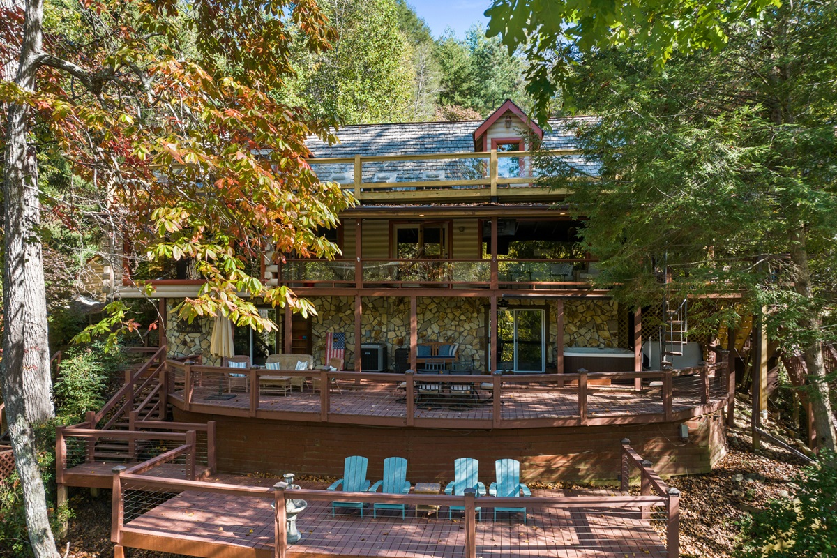 4 Bedrooms • 4 Bathrooms (3 full, 1 half) 4 Baths (3 full, 1 half) • Sleeps 9-12NEW! Beautiful mountain lodge located in the mountains of Blue Ridge in a private gated community. Lakeside Retreat is situated on a mountain side overlooking your own 15-acre stocked lake! Views of the lake from every level of the log cabin including your own dock for fishing, launching a kayak/canoe (provided) or just relaxing and watching the sunset. Located only 10 miles from downtown Blueridge.